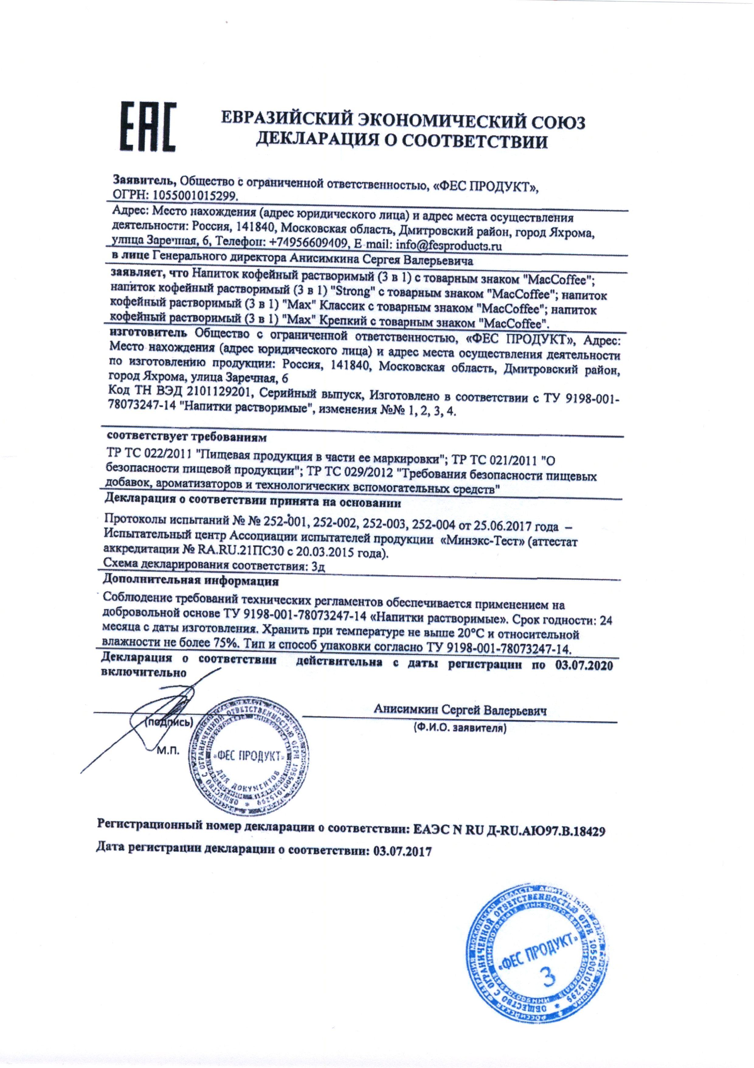 Способ приготовления: высыпать в чашку содержимое одного пакетика MacCoffee 3 в 1, добавить горячую, но не кипящую воду.