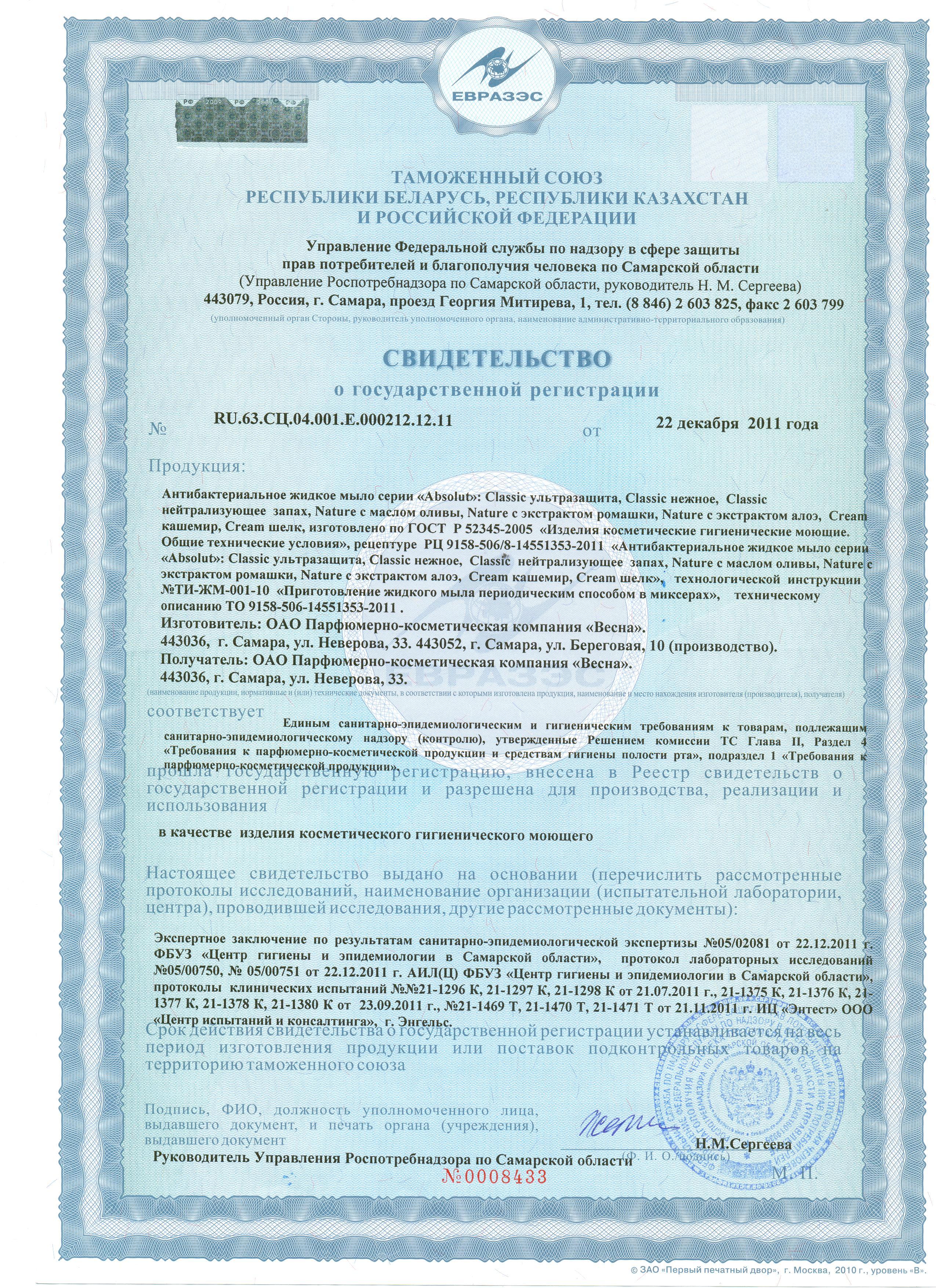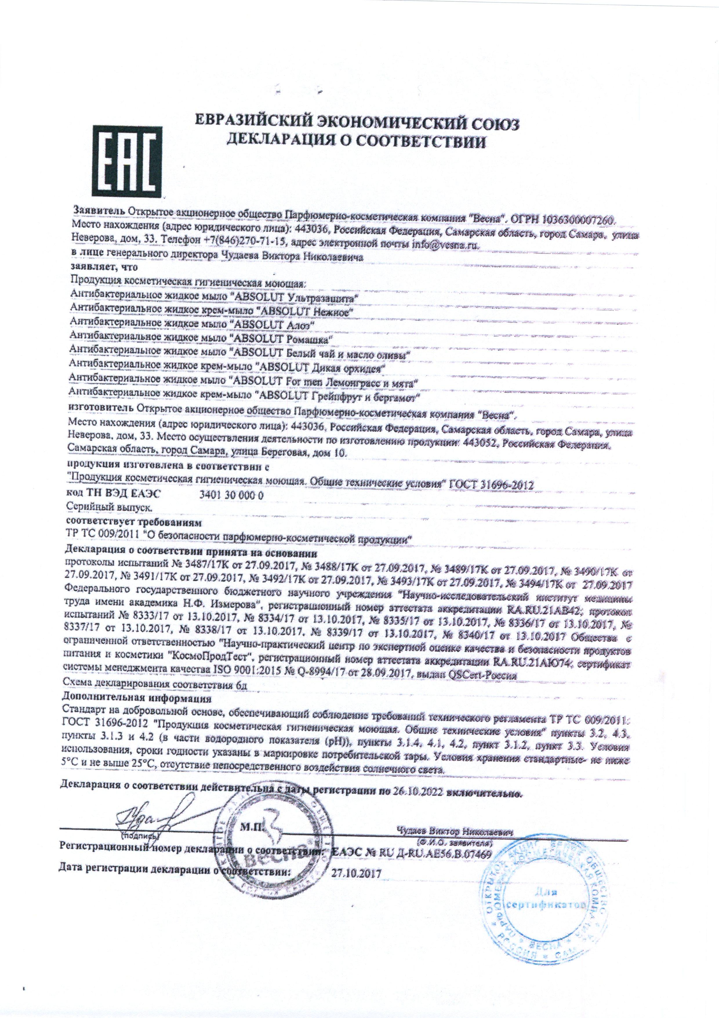 Сертификат на товар - Мыло жидкое Absolut Classic антибактериальное 250 мл