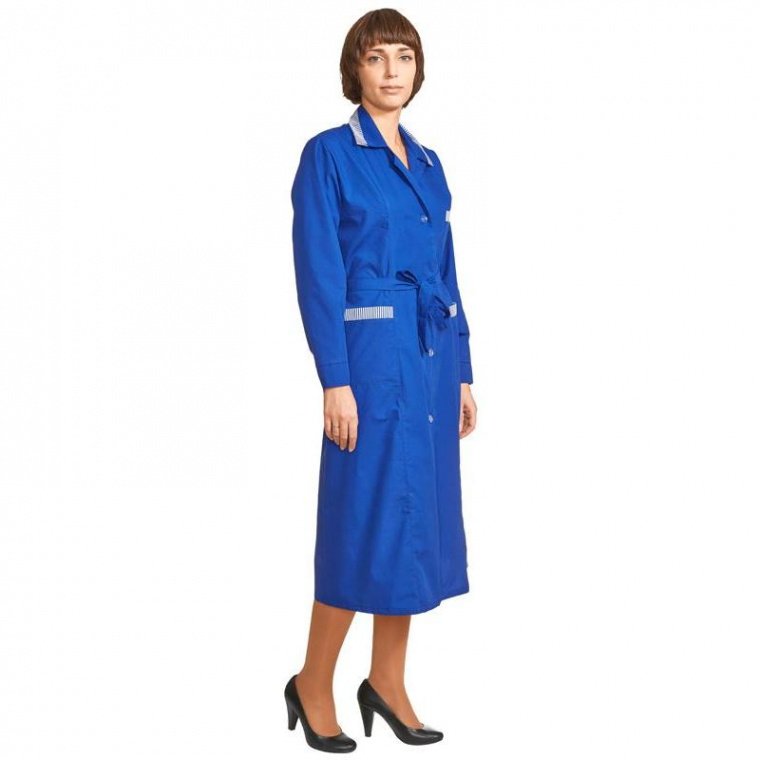 Женский халат для горничных и уборщиц у01-ХЛ размер 56-58, рост 158-164 см. Изготовлен из смесовой ткани Ти-Си, цвет васильковый (ярко-синий), состав — 65% полиэфира и 35% хлопка. Ти-Си — материал, приятный на ощупь, гигиеничен и долговечен. Не мнется, легко и быстро стирается, быстро сохнет. Долго сохраняет свой первоначальный яркий цвет. Ткань «дышит», благодаря входящему в состав хлопку, имеет повышенный срок службы и проста в уходе, благодаря полиэфиру. Рукав длинный. Воротник отложной с лацканами, есть накладные карманы. Отлет воротника, верхние части карманов и края рукавов отделаны светлой тканью. Халат застегивается на пуговицы. Униформа рекомендована для сферы обслуживания, клининга, гостиничного бизнеса.