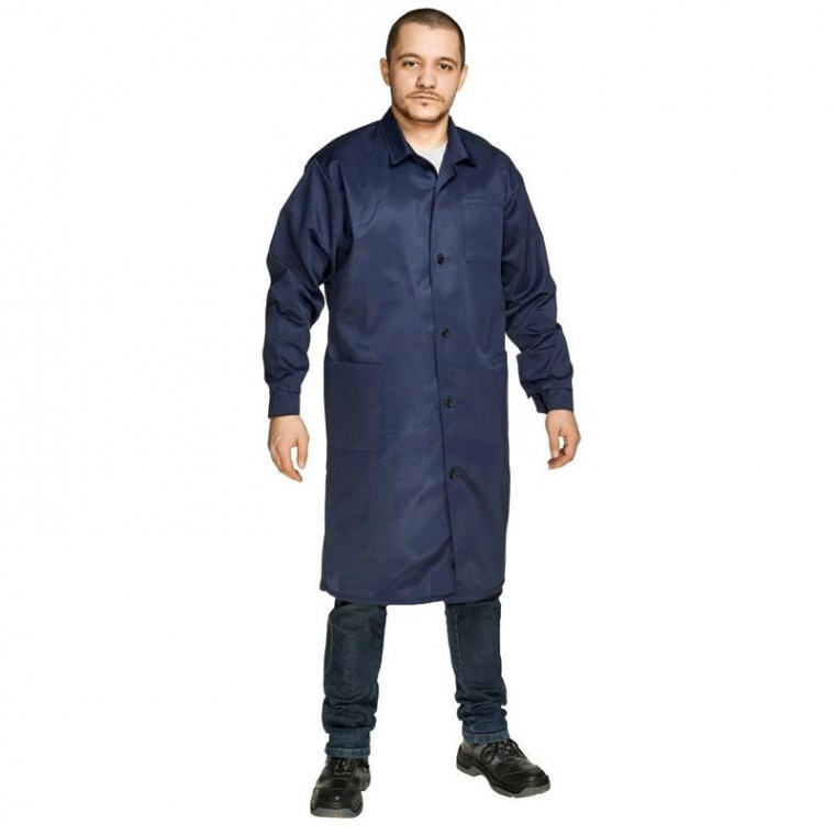 Мужской халат «Профессионал» с центральной застежкой. Изготовлен из водоотталкивающей ткани синего цвета, состоящей на 65% из полиэфира и на 35% из хлопка. Воротник отложной. На лицевой стороне халата расположены лацканы и накладные карманы. Размер халата — 60-62 при росте от 170 до 176 см.