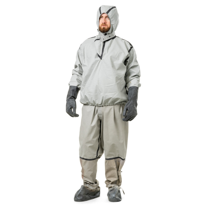 Костюм летний предназначен для защиты от растворов кислот, щелочей, токсичных веществ, вредных биологических факторов. Изготавливается из прорезиненной ткани Т-15, УНКЛ и состоит из цельнокроеных брюк с чулками, куртки с капюшоном и перчаток. На рукавах куртки имеются манжеты, облегающие запястье. Вес костюма составляет 3 кг. В комплектацию костюма "Л-1" входят: полукомбинезон с притачными осоюзками, куртка с капюшоном, сумка, перчатки (из ткани Т-15 или резиновые цельнолитые), 6 пластмассовых шпеньков (типа "пукля") для застежки.Костюм "Л-1" применяется совместно со средствами индивидуальной защиты органов дыхания (СИЗОД). Применение костюма необходимо осуществлять строго в соответствии с его предназначением, при известных составах опасных веществ, оказывающих вредное воздействие на организм человека. Не допускается использование костюма при неизвестном составе загрязняющих окружающую среду веществ. Температурный диапазон применения костюма "Л-1" от -40 до 40 °C, время работы в костюме согласовывается с нормативами КЗОТ. При заражении костюм подвергают обработке. Может использоваться многократность пластмассовых шпеньков для застежки.Области применения: химическая промышленность, сельское хозяйство, коммунальные службы, сантехнические работы. Костюм "Л-1" не предназначен для работ, осуществляемых при пожарах.Размер 48-50. Рост до 165 см.