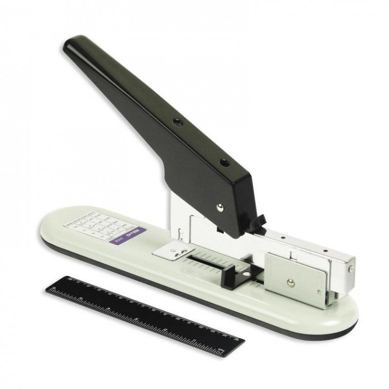Мощный степлер KW-Trio с максимальной толщиной сшивания бумаги до 100 листов. Глубина закладки листов регулируется от 7 до 65 мм. Пластиковая основа степлера не царапает поверхность стола и предотвращает скольжение. Тип и размер используемых скоб — N23/6, 23/8, 23/10, 23/13. Загрузка скоб в степлер осуществляется фронтально. Размер: 290×149×76 мм.