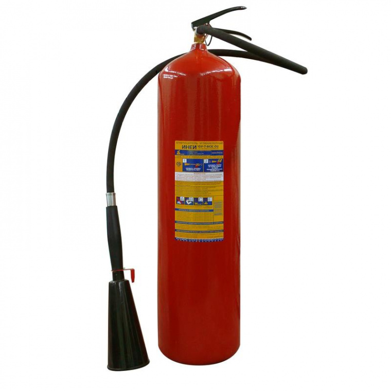 Огнетушитель углекислотный ОУ-7 Иней BCE — самый большой переносной огнетушитель. Имеет повышенную огнетушащую способность по сравнению с предусмотренной ГОСТ Р. Заряжен 7 кг двуокиси углерода высшего сорта. Имеет повышенный ранг по классу В по сравнению с обычным ОУ7 (70В против 55В). Поскольку огнетушащим веществом является сухой газ, то при срабатывании огнетушителя не создается продуктов горения, не задымляется помещение, не наносится ущерб защищаемому имуществу, а также не создается препятствий для эвакуации людей, как при применении порошкового огнетушителя. Наиболее эффективен для защиты имущества, не имеющего риска повреждения от воздействия низкой температуры (перепада температур). Рекомендуется использовать в качестве дополнительного огнетушителя к основному, имеющему ранг 2А — для защиты общественных зданий и помещений категорий Г и Д, или имеющему ранг 4А, — для защиты помещений категорий А, Б, В, при наличии в них электроустановок до 10 000 В. Баллон высокого давления по ГОСТ 949 на рабочее давление 15 МПа (150 атм). Рекомендуется использовать при температуре от −40 до 50 °C. Огнетушитель способен подавать струю огнетушащего состава на расстояние не менее 3-х метров.