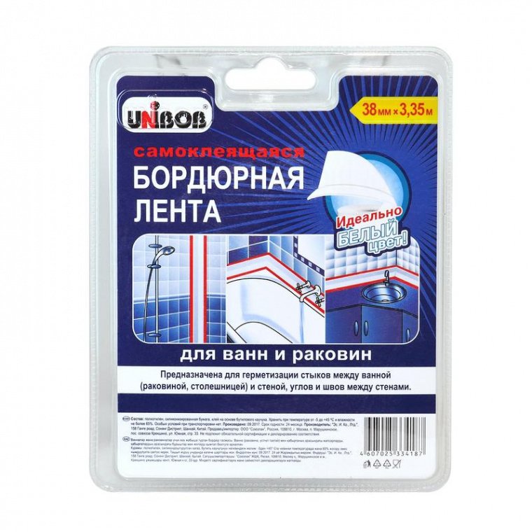 Клейкая бордюрная лента Unibob белого цвета используется для герметизации стыков между стенами и примыкающими к ним раковинами, ваннами, шкафами и другими конструкциями в жилых и нежилых помещениях. Бордюрная лента Unibob применяется для заделывания швов при укладке напольной и настенной плитки. Ширина бордюрной ленты позволяет герметизировать или декорировать стыки между рабочими поверхностями, расстояние между которыми — до 60 мм. Прочность крепления ленты обеспечивается за счет применения клея с основой из бутилового каучука.