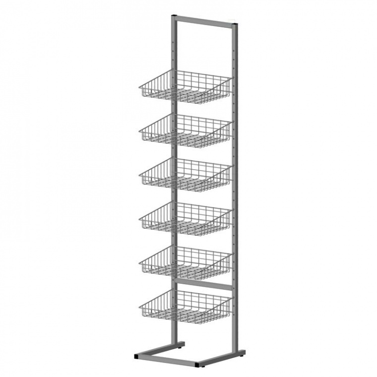 Стеллаж, разборный на две части + съёмная регулируемая опора, шесть сетчатых регулируемых по высоте корзин, для любой группы товаров. Нагрузка на одну корзину до 10 кг. Материал: металл; труба профиль: 25х25mm; проволока: 3 и 5 мм. Цвет: белый.