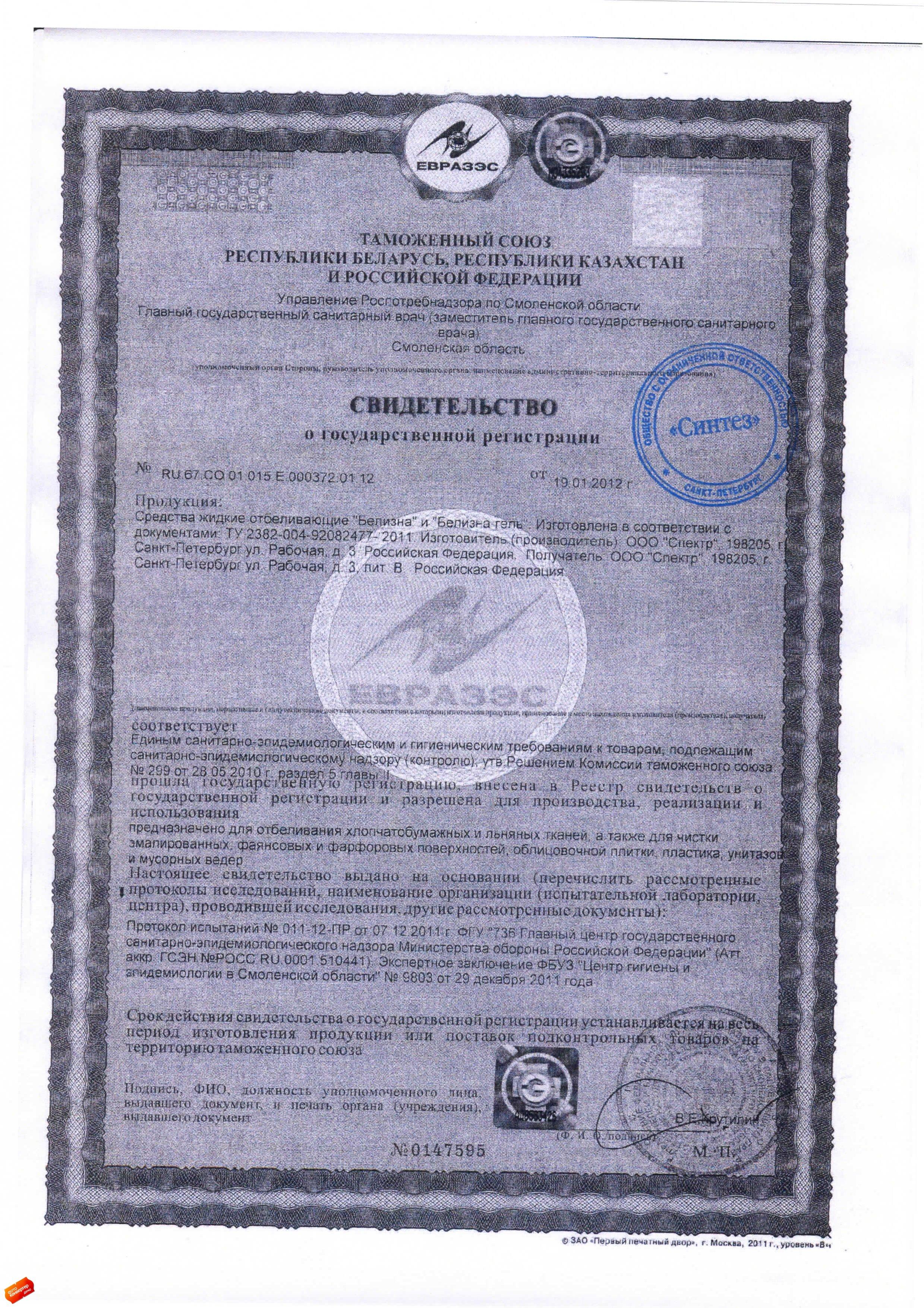 Сертификат на товар - Отбеливатель Белизна жидкость 1 л