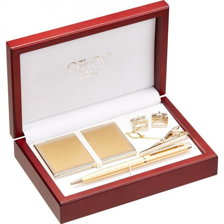Подарочный мужской набор из коллекции Verdie отлично подойдет в качестве презента для коллеги в офисе, также в качестве корпоративного презента или на день рождения знакомому. Набор состоит из шариковой ручки, визитницы, зажима для галстука и запонок. Ручка золотистого цветы выполнена из латуни с многослойным лаковым покрытием. Толщина линии письма 0.5 мм. Благодаря возможности гравировки на ручке этим набором вы подчеркнете значимость и свое отношение к тому, для кого предназначен этот презент. Визитница, зажим для галстука и запонки изготовлены из латуни с декоративной отделкой. Набор поставляется в подарочном деревянном футляре. Размер: 180×120×45 мм. Страна производства — Китай.