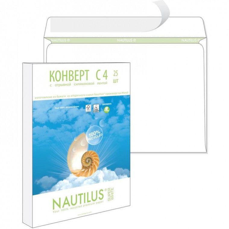 Конверты С4 (соответствует формату бумаги А4), 229×324 мм, без окна, зеленая внутренняя запечатка, белая силиконовая лента, переработанная бумага Nautilus плотностью 90 гр/кв.м. Nautilus сочетает в себе высокое качество и экологичность. Экологически чистый продукт, изготовленный из 100% вторичного сырья. Значение вторично переработанного сырья. Во-первых, ресурсы многих материалов на Земле ограничены и не могут быть восполнены в сроки, сопоставимые со временем существования человеческой цивилизации.Во-вторых, попав в окружающую среду, материалы обычно становятся загрязнителями.В-третьих, отходы и закончившие свой жизненный цикл изделия часто (но не всегда) являются более дешевым источником многих веществ и материалов, чем источники природные. Предназначены для пересылки 50 листов А4 формата, что равно 250 гр.веса.