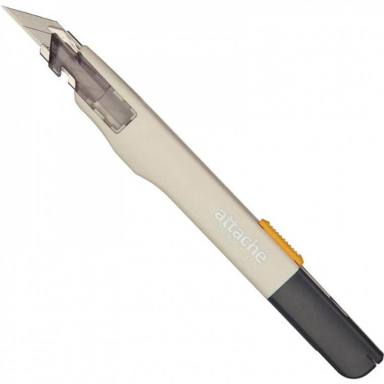 Канцелярский нож Attache Selection Genius является простым в использовании, удобным и доступным инструментом. Активно используется в канцелярии, а также для ремонтных работ, не требующих приложения больших усилий. Корпус канцелярского ножа выполнен из пластика, система блокировки лезвий защелка. Дизайн корпуса рассчитан для комфортного использования как левшами, так и правшами. Металлические направляющие для лезвия увеличивают прочность ножа, создает дополнительную жесткость при разрезании плотных материалов. Выдвижное сменное лезвие, шириной 9 мм, можно установить на любую удобную длину, заменить в случае необходимости. Запасные лезвия для ножей артикул 1043129.
