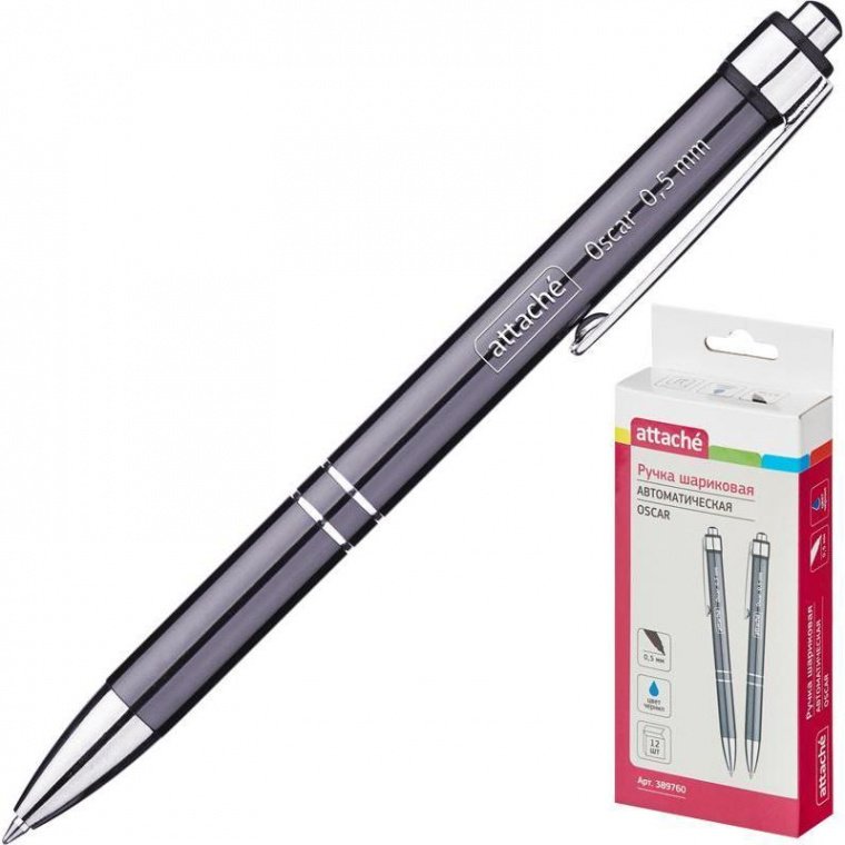 Шариковая ручка Attache Oscar в серебристом алюминиевом корпусе. Клип — марганцевая сталь. Наконечник — ABS пластик. Кнопка — ABS пластик (хромированный). Эффектное светоотражающее покрытие корпуса. Чернила синего цвета обеспечивают мягкое нанесение линий толщиной 0,5 мм.