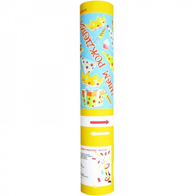 Пневматическое устройство «С Днем рождения» абсолютно безопасное, предназначено для использования в помещении и на улице. «Выстрел» производится энергией сжатого воздуха, находящегося в баллоне изделия, поэтому устройство абсолютно пожаробезопасно. Дальность выстрела от 6 до 8 м. Наполнитель — разноцветная мишура. Размер изделия — 30 см.