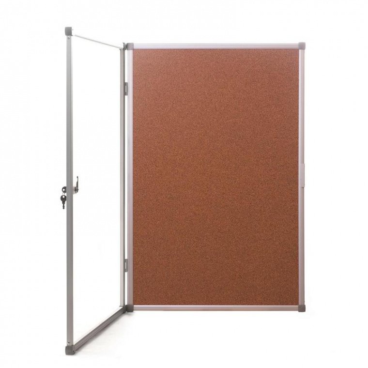 Пробковая доска витрина на замке. Размер 60×90 см. Для размещения информации с помощью силовых кнопок и булавок. Рамка доски и дверцы из алюминия, материал дверцы — оргстекло. Замок врезной, поворотного действия с индивидуальными ключами. Монтажный крепеж и 2 ключа в комплекте.