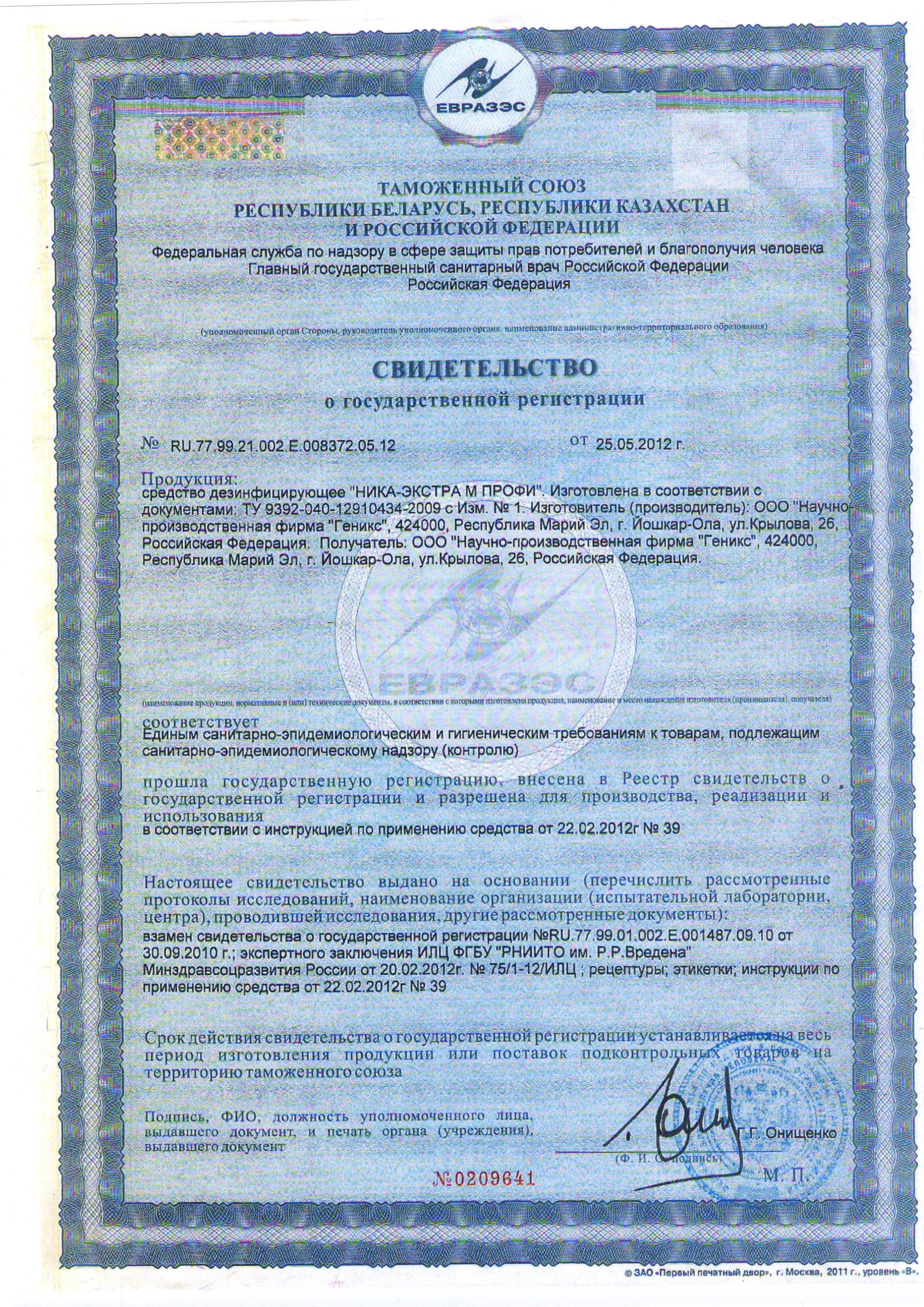 Сертификат на товар - Дезинфицирующее средство Ника Экстра М Профи 1 л (концентрат)