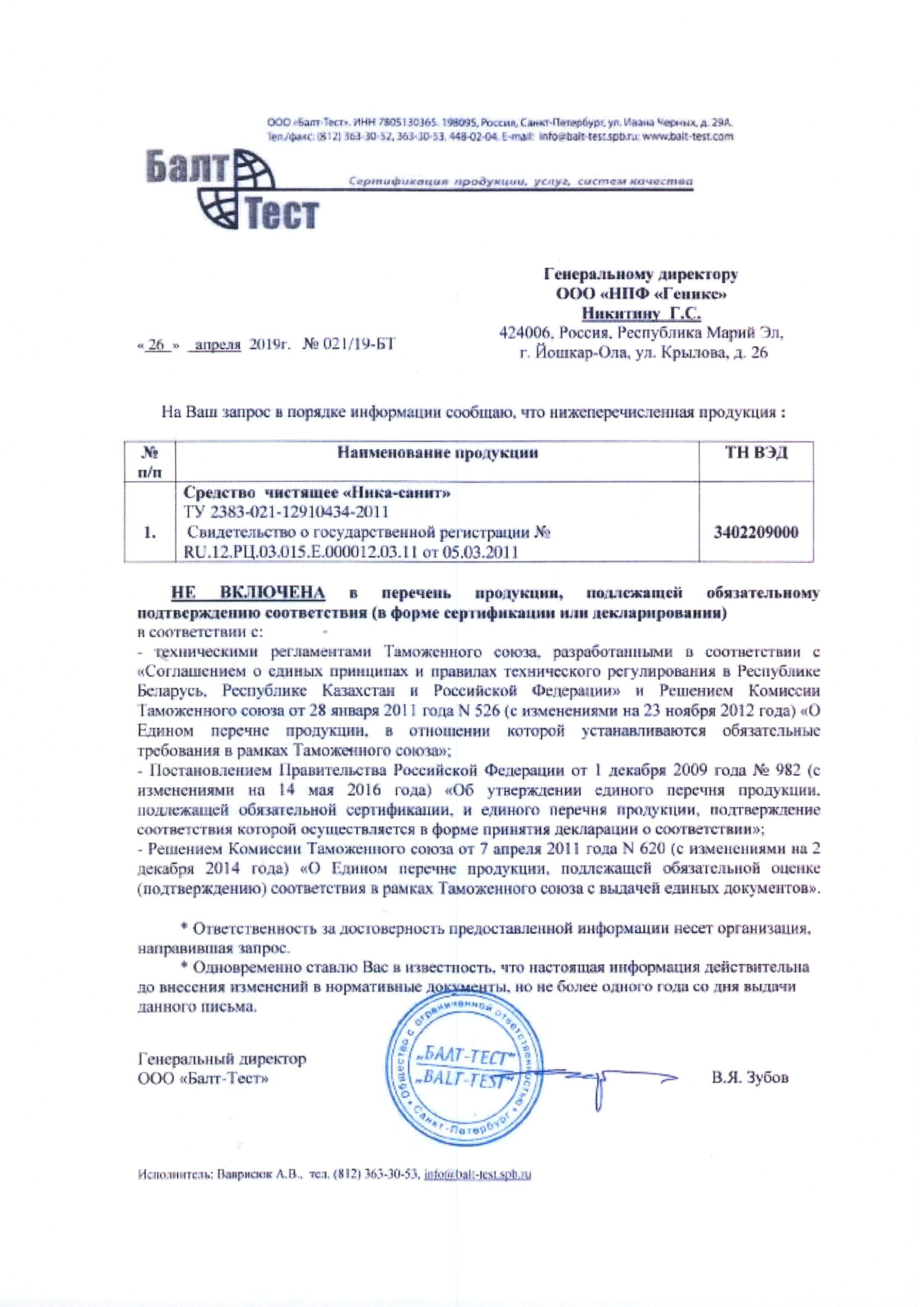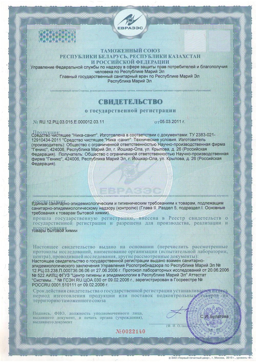 Сертификат на товар - Чистящее средство для сантехники Ника Санит 0.7 кг