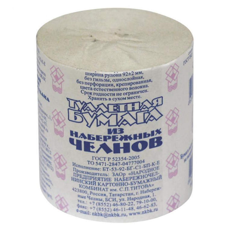 Однослойная туалетная бумага «Из Набережных Челнов» натурального цвета выполнена без перфорации. Длина намотки в рулоне — 53 метра. Изготовлена из макулатуры.