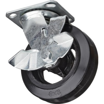 Колесные опоры большегрузные поворотные с тормозом, литая черная резина, чугунный обод, платформенное крепление, роликовый подшипник.Внимание! Набор крепежных элементов (метизы) в комплект поставки не входят. Приобретаются отдельно.