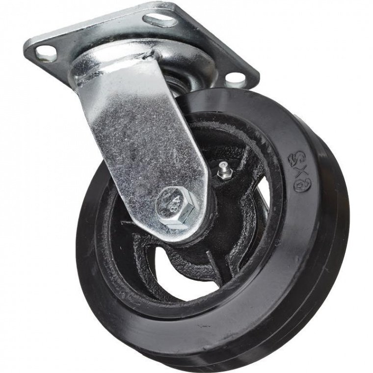 Колесные опоры большегрузные поворотные, литая черная резина, чугунный обод, платформенное крепление, роликовый подшипник. Диаметр составляет 160 мм. Допустимая нагрузка 230 кг. Расстояние между отверстиями для крепления: по широкой стороне 105 мм, по узкой стороне 75 мм.