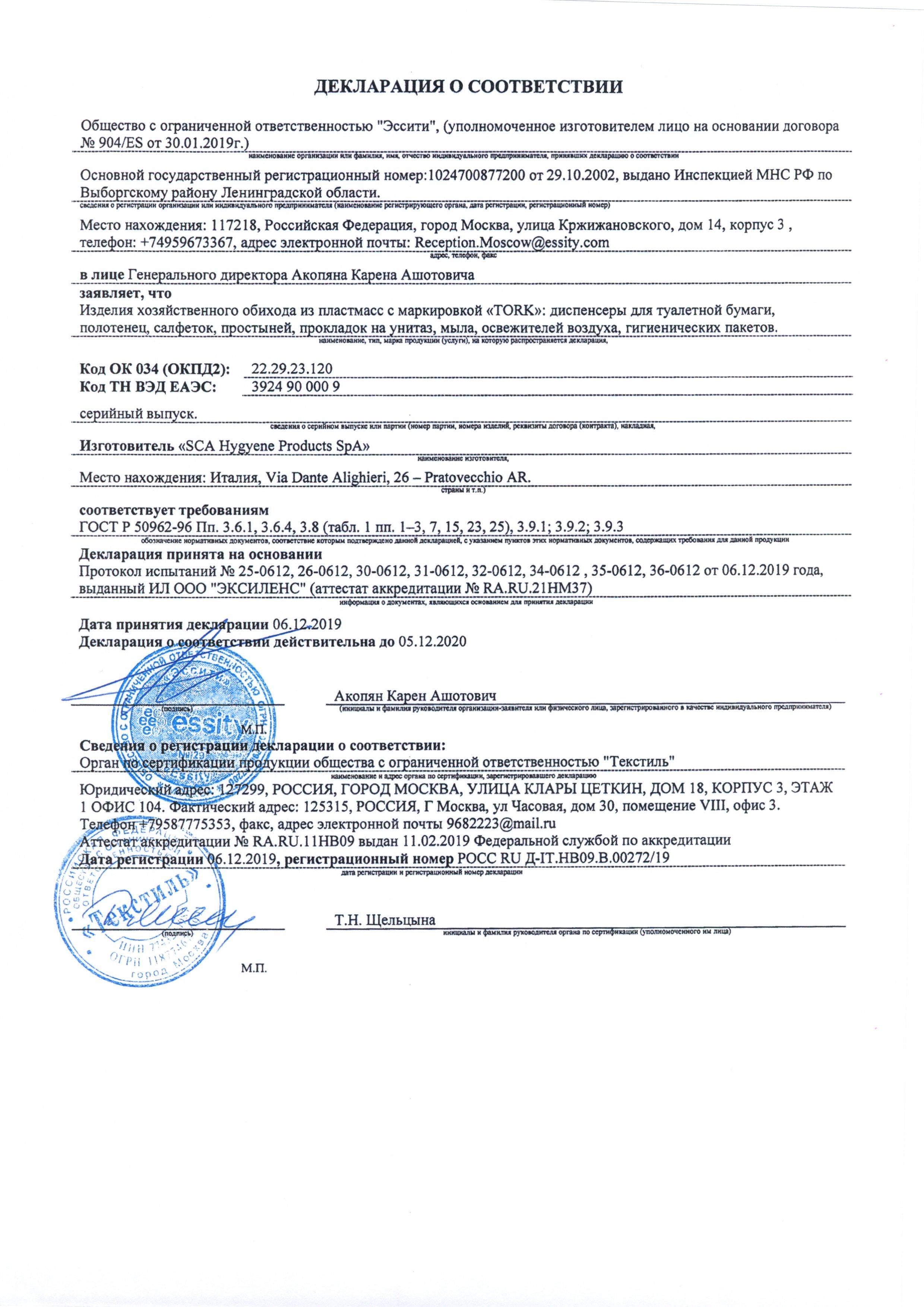 Сертификат на товар - Диспенсер для салфеток Tork 270023 F1 подвесной пластиковый белый