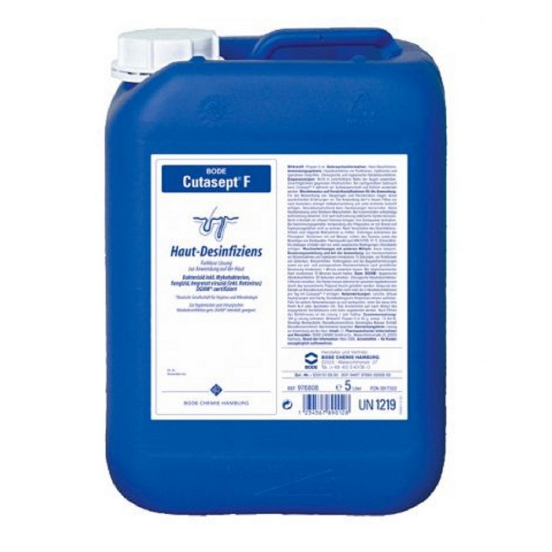 Антисептик кожный "Кутасепт Ф" спиртовой 5 л. Химический состав дезсредства: ЧАС, спирты, вспомогательные компоненты. Действующие вещества: алкилдиметилбензиламмоний хлорид (АДБАХ) 0.025 %, изопропиловый спирт (пропанол-2) 63 %, компоненты, улучающие состояние кожи. Сфера применения: ЛПУ, детские учреждения (детсады, школы и т.п.), пенитенциарные учреждения, предприятия общественного питания, предприятия продовольственной торговли, коммунальные объекты (бани, бассейны, гостиницы, общественные туалеты и т.п.), учреждения соцобеспечения, парикмахерские, косметические и (или) массажные салоны, санитарный транспорт, в быту населением, предприятия фармацевтической промышленности, объекты курортологии. Объекты обработки: гигиеническая обработка рук, обработка инъекционного поля, обработка локтевых сгибов доноров, обработка операционного поля, обработка рук операционных медицинских сестер, акушерок и других лиц, участвующих в операциях и приеме родов, обработка рук хирургов. Класс опасности: при введении в желудок - 4; при нанесении на кожу - 4; рабочего раствора - 4. Активно в отношении: бактерии (Mycobacterium tuberculosi, возбудители ВБИ, грамотрицательные бактерии, грамположительные бактерии), вирусы (ВИЧ, Гепатита В), патогенные грибы (кандида). Срок годности: 5 лет. Страна производства: Германия.