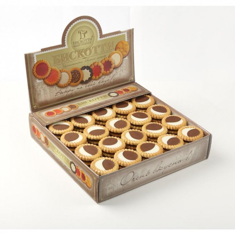 Печенье ’Бискотти’ упаковано в фирменную коробку с плотными стенками и прозрачным верхом для наглядной демонстрации потребителям. Этот вариант удобен для офисных коллективов, магазинов и пунктов питания. Приятного аппетита!