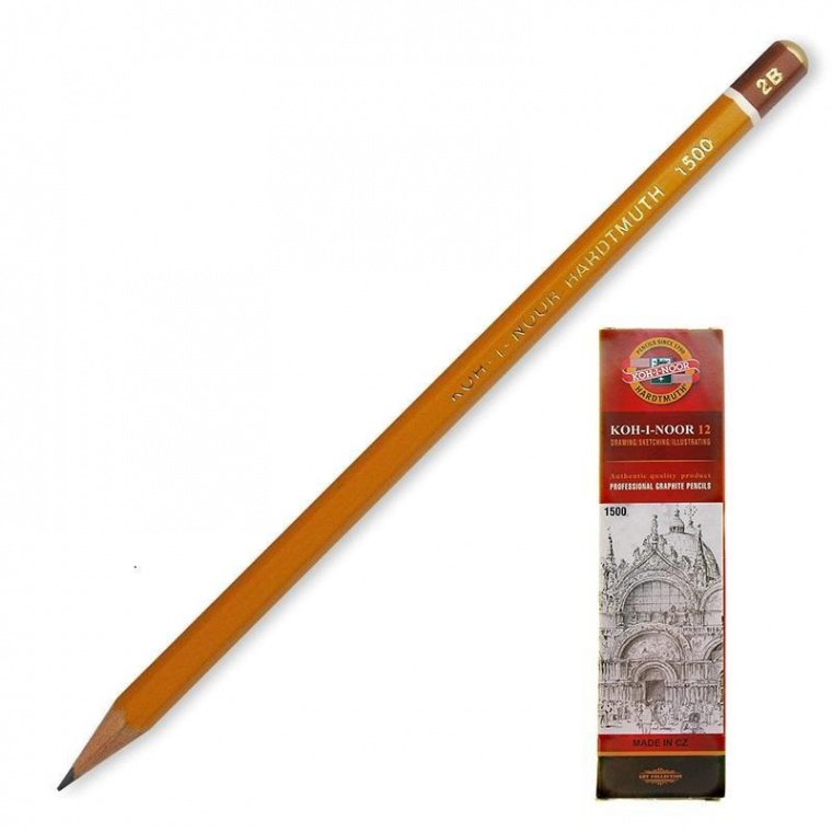 Карандаш чернографитный Koh-I-Noor 1500 в шестигранном деревянном корпусе, покрытом двухцветным лаком на водной основе. Поставляется заточенным, не оснащен ластиком. Твердость грифеля — 2В. Страна производства — Чехия.