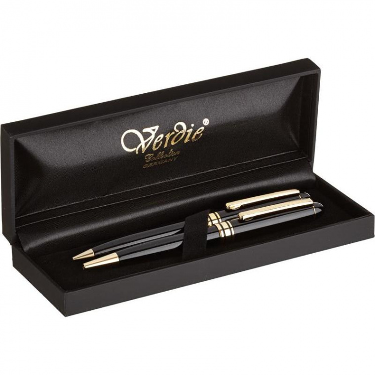 Подарочный набор из коллекции Verdie отлично подойдет в качестве презента для коллеги в офисе, также в качестве корпоративного презента или на день рождения знакомому. В набор входит шариковая ручка и механический карандаш. Корпус ручки и карандаша изготовлен из стали с верхним покрытием из черной эмали, предметы декорированы отделкой ’’под золото’’. Толщина линии письма шариковой ручки — 0.5 мм. Цвет чернил — синий. Стержень меняется. Подходит стержень шариковый Attache тип Parker синий 98 мм (толщина линии 0.7 мм); Стержень шариковый ICO Silver тип Parker синий 98 мм (толщина линии 0.5 мм). Набор поставляется в подарочном деревянном футляре. Размер: 185×90×45 мм. Страна производства — Китай.