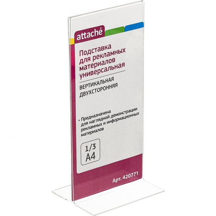 Вертикальная двухсторонняя настольная информационная подставка Attache изготовлена из прозрачного акрила, имеет устойчивое основание. Позволяет размещать постеры и другие демонстрационные материалы формата 1/3 А4. Поставляется в индивидуальной защитной пленке. Перед применением необходимо снять голубую защитную пленку. Размеры (ВxШxГ): 100×210×70 мм.