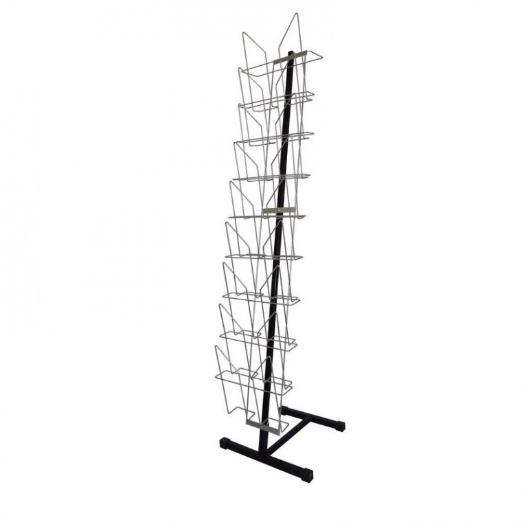 Стойка металлическая, двухцветная (основание+ рама: черный; блок карманов: алюминий хром), разборная. 9 карманов для печатной продукции формата А3. В профиль наклон 11 градусов. Глубина кармана 55 мм. Материал: металл; труба профиль: 20х20мм, 25х25 мм; проволока сечение: 4 и 5 мм.