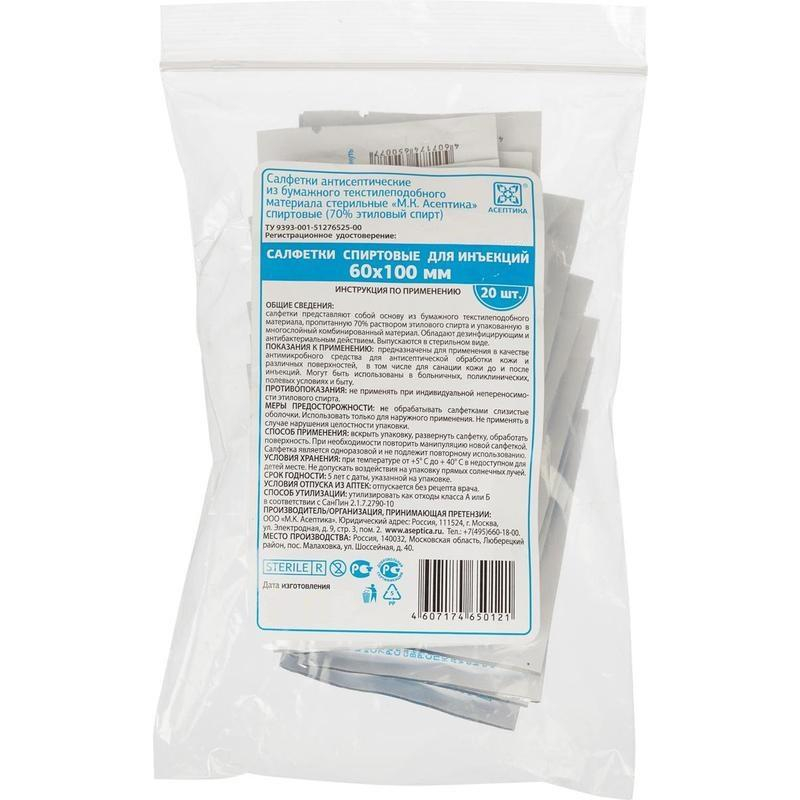 Салфетки для инъекций Асептика этиловый спирт 60x100 мм (20 штук в упаковке). Салфетка изготовлена из бумажного текстилеподобного материала. Пропитка спиртовая (70% этиловый спирт). Предназначены для дезинфекционной обработки кожи до и после инъекций. Салфетка обеспечивает эффективную санацию кожи в зоне постановки инъекций и сокращает количество манипуляций. Многослойный упаковочный материал обеспечивает сохранение свойств продукта в течение всего срока годности. Упаковка легко вскрывается без использования ножниц. Материал салфетки: спанлейс. Плотность: 40 г/м. кв.