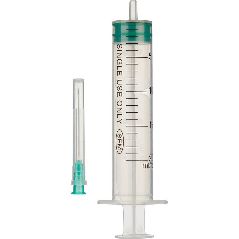 Шприц трехкомпонентный SFM 20 мл 21G (0.8x40 мм, 5 штук в упаковке). Предназначен для лекарственных инъекций. Шприц одноразовый с наконечником концентрического типа (международный стандарт ISO 7886-1). Материал корпуса - полипропилен. Корпус прозрачный. Градуировка - 1 мл. Уплотнитель поршня из термопластичного эластомера зеленого цвета. Уплотнитель поршня не содержит латекс, обработан силиконовой смазкой. Четкая контрастная градуировка способствует максимально точной дозировке. Насечки на упоре исключают скольжение пальцев в процессе инъекции. Форма и размер ободка вокруг корпуса обеспечивают удобство и надежность захвата и удержания шприца в момент использования. Прочное двойное стопорное кольцо предотвращает случайное выдергивание поршня в момент набора медицинского средства. Игла одета на шприц. Отдельная стерильная блистерная упаковка с отогнутым краем - плотная медицинская бумага и прозрачная пленка (состав пленки - полиэтилен/полиамид). Упаковка вскрывается без образования бумажной бахромы. Нетоксично, апирогенно. Стерилизация - этиленоксид. На корпусе шприца несмываемая шкала с ценой деления 5 мл. Тип наконечника: Luer. В упаковке - 5 штук. Срок годности: 5 лет.