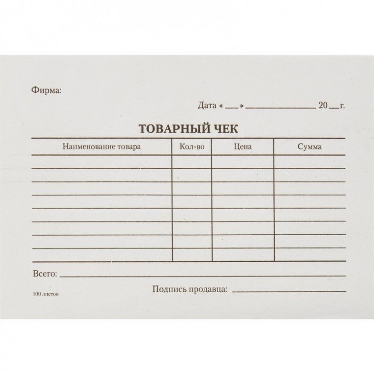 Бухгалтерские бланки — товарный чек. Подтверждают факт приобретения товара у продавца, служат для обоснования расходов (совместно с кассовым чеком). Бланки отпечатаны на офсетной бумаге формата А6, склеены по 100 штук в виде книжки. В комплекте 5 книжек, упакованных в термоусадочную пленку.