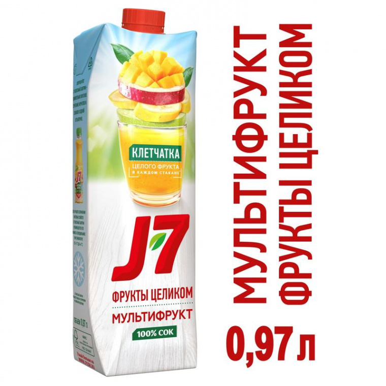 Сок J7 мультифрукт с мякотью 0.97 л. Вкусный освежающий коктейль из соков нескольких тропических фруктов: манго, ананаса, апельсина и банана. Напиток имеет приятный экзотический вкус, а в составе нет никаких вредных веществ, консервантов и красителей искусственного происхождения. Новая стильная картонный пакет, оснащена удобной завинчивающейся крышкой, которая не даст напитку пролиться, даже если пакет упадет. Поэтому нектар можно брать с собой в путешествие или на пикник. Предназначен для питания детей c 3-х лет.