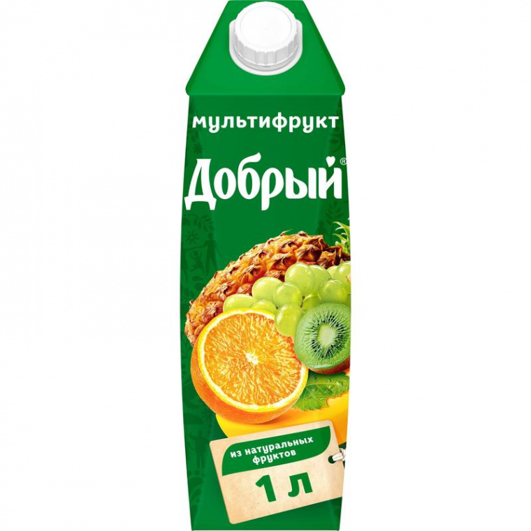 Нектар Добрый мультифрут 1 л. Мультифрут — это нектар сочетающий в себе разные фрукты, такие как спелые апельсины, нежные бананы и сочные ананасы. Вместе эти фрукты создают неповторимое ощущение тропического лета. Мультифруктовый — нектар, обогащён провитамином А.