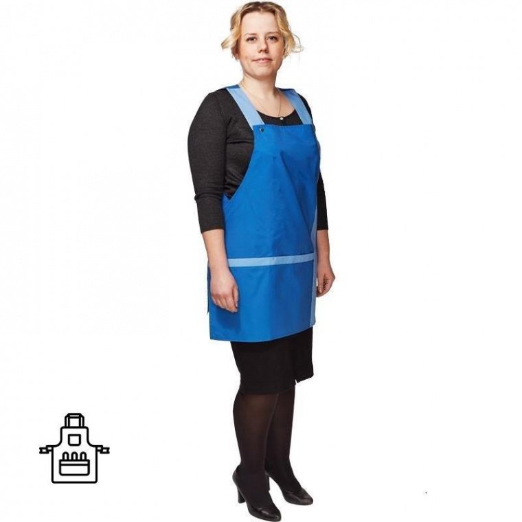 Фартук с бретелями на кнопках, с передним накладным карманом, ширина по талии регулируется завязками. Изготовлен из смесовой ткани «Сису» плотностью 139 г/кв.м (77% полиэфир, 23% хлопок). Цвет фартука — васильковый.