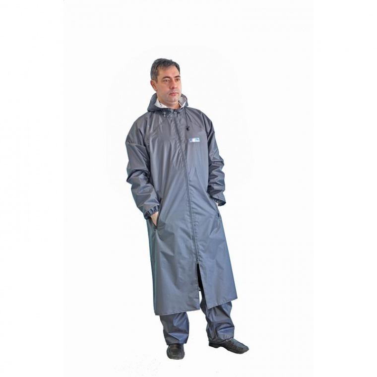 Плащ темно-серого цвета с центральной водостойкой двухходовой застежкой на молнию Dry Zip. Рукава на манжете с эластичной лентой, капюшон с регулировкой объема с помощью кулисы со шнуром и ограничителями, на полочке два врезных кармана с застежкой. Для комфортного теплообмена имеются вентиляционные отверстия под рукавами и на спине. Все швы герметичны. Модель отличается легкостью. Специальная прочная мембранная плащевая ткань: водоупорность более 5000 мм водяного столба, паропроницаемость более 6000 г/кв.м.