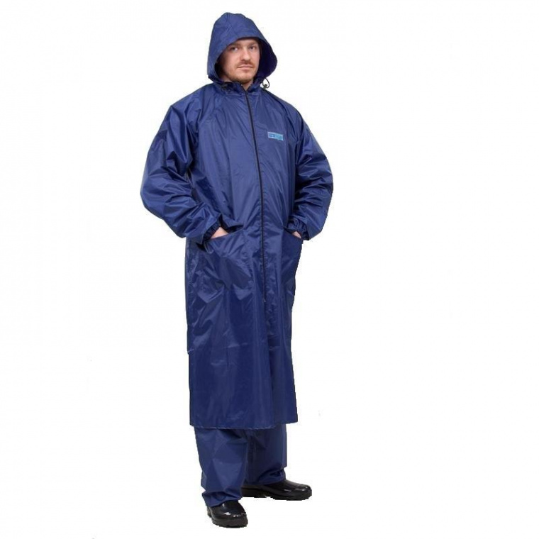 Влагонепроницаемый плащ синего цвета с застежкой на молнии, клапаном против ветра, капюшоном, двумя карманами с клапанами, манжетами на рукавах. Все швы загерметизированы специальной лентой. Непромокаемый плащ изготовлен из прочной плащевой ткани с ПВХ-покрытием. Плотность ткани — 225 г/кв.м. Вес плаща составляет около 1000 г. Водоупорность — не менее 5000 мм водяного столба.
