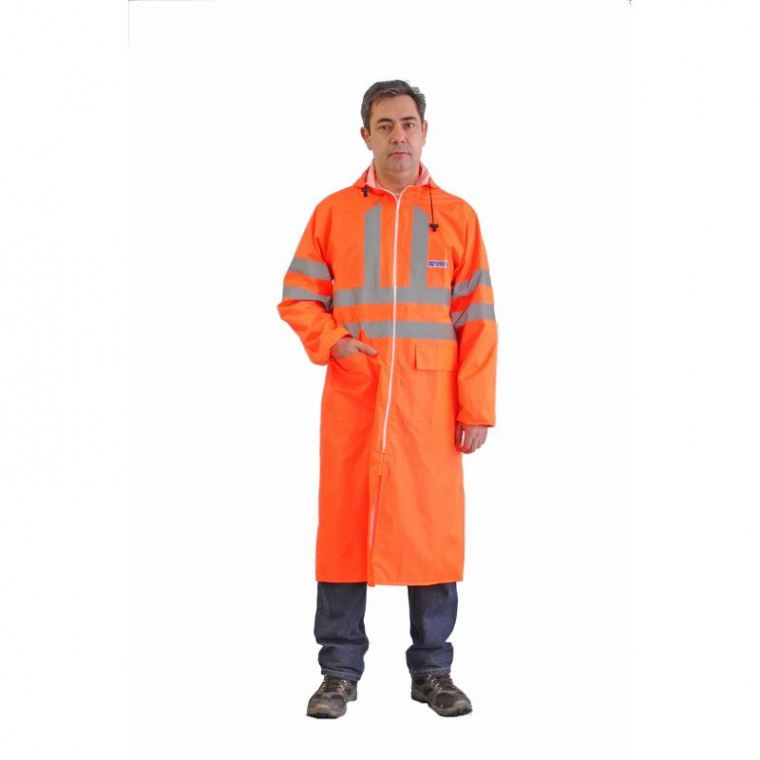 Влагозащитный плащ с центральной застежкой на молнию, двумя накладными карманами. Кулиска на капюшоне дает возможность регулировать объем для комфортной посадки. Цвет оранжевый, светоотражающая полоса шириной 50 мм. Все швы плаща загерметизированы специальной лентой. Изготовлен из прочной плащевой ткани с ПВХ-покрытием. Плотность ткани — 225 г/кв.м. Водоупорность — не менее 5000 мм водяного столба. Изделие экологично и соответствует европейским стандартам по содержанию вредных веществ.