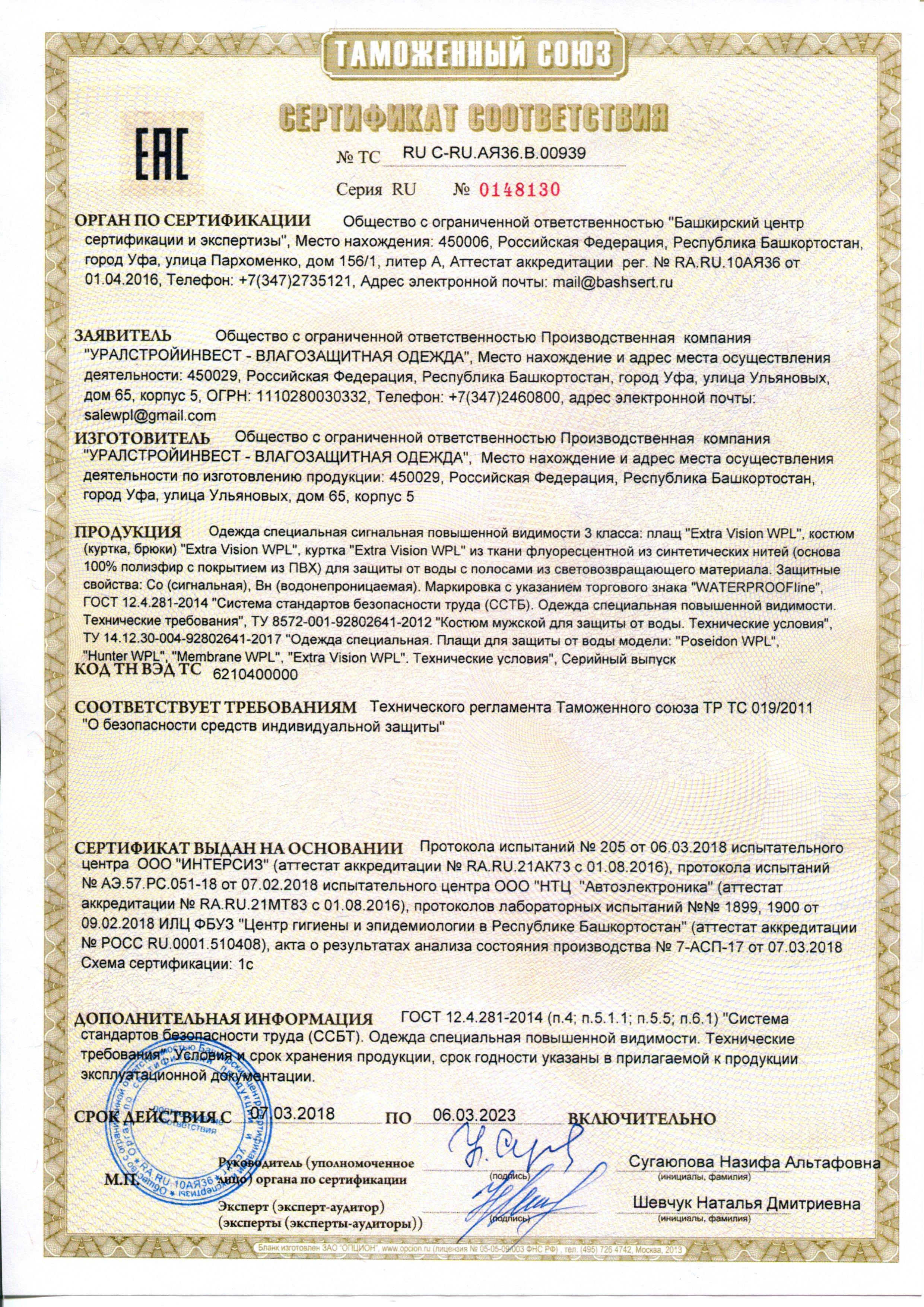Сертификат на товар - Плащ ПВХ Extra-Vision WPL, оранжевый, с СОП (размер 44-46, рост 170-176)