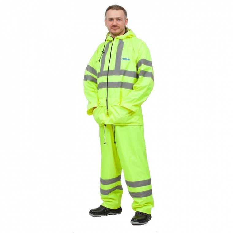 Костюм влагозащитный изготовлен из прочной плащевой ткани с ПВХ-покрытием. Цвет лимонный, светоотражающая полоса шириной 50 мм. Плотность ткани — 225 г/кв.м. Водоупорность — не менее 5000 мм водяного столба. Изделие экологично и соответствует европейским стандартам по содержанию вредных веществ. Куртка с центральной застежкой на молнию и капюшоном. Кулиска на капюшоне и внизу куртки дает возможность регулировать изделие для комфортной персональной посадки. Брюки прямого силуэта. Все швы костюма загерметизированы специальной лентой.