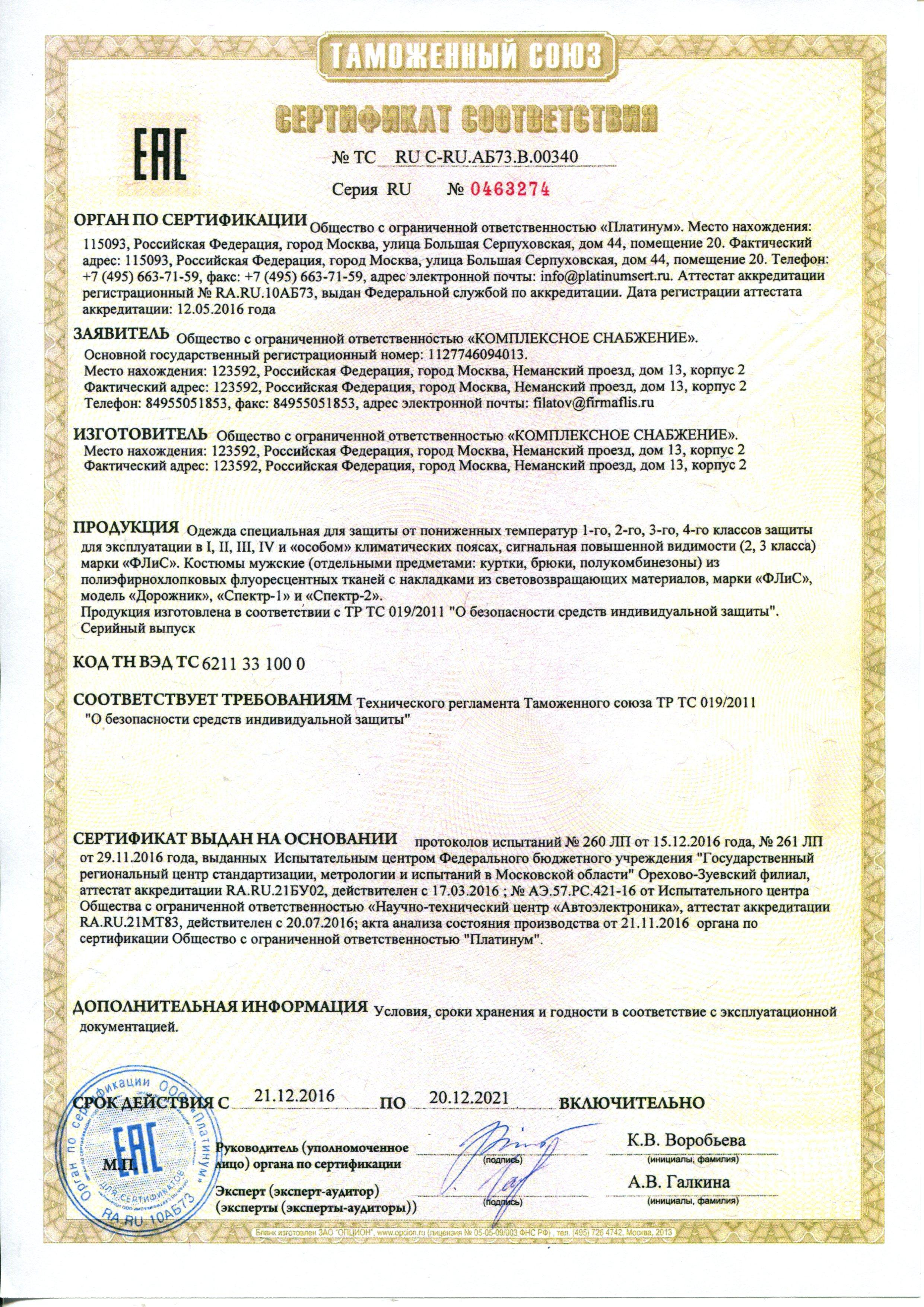 Сертификат на товар - Костюм зимний Спектр-2 куртка и полукомбинезон (размер 60-62, рост 182-188)