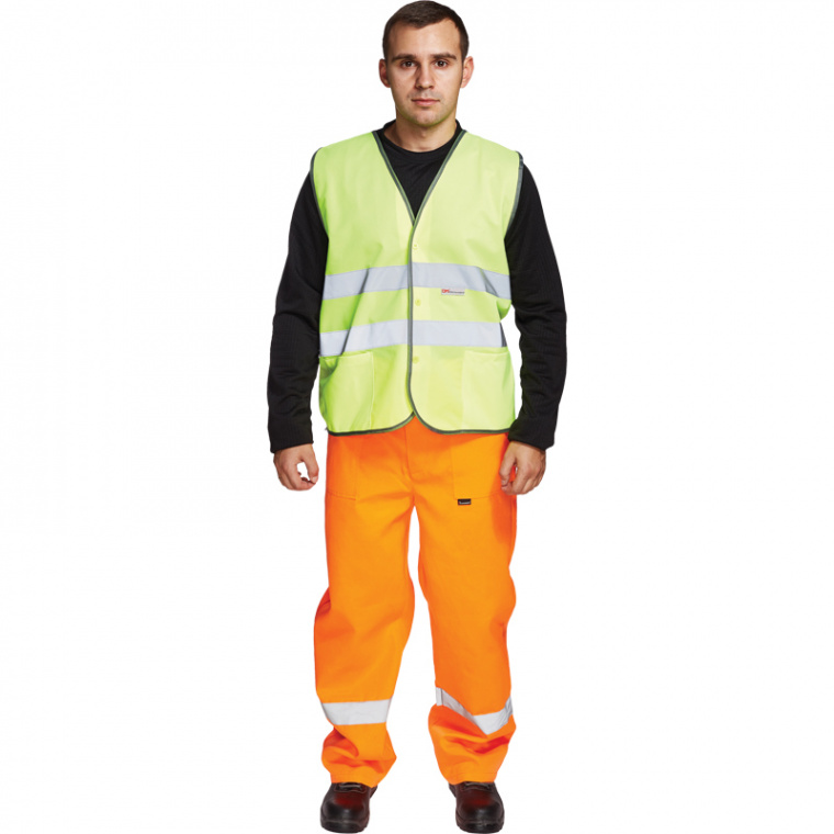Сигнальный жилет незаменим при проведении ремонтно-строительных работ на проезжей части или железной дороге и в других опасных зонах. Рекомендован к использованию работниками коммунальных служб, водителями автомобилей, пешеходами и велосипедистами. Сочетание неонового лимонного цвета и светоотражающих полос обеспечивает его заметность как днем, так и в темное время суток. Жилет с двумя накладными карманами и центральной застежкой на пуговицы надевается поверх другой одежды. Изделие соответствует второму классу защиты, изготовлено из 100% полиэфира плотностью 130 г/кв.м. Ширина светоотражающей ленты — 50 мм.