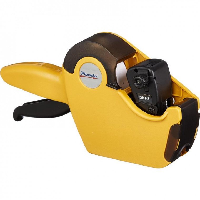 «Pronto H8: один из простых видовэтикет-пистолетов. Однострочный. В строке умещается 8 символов, что позволит напечатать на этикетке цену товара, состоящую из большого количества цифр. Пистолет удобен и практичен в использовании, прост в обслуживании. Этикет-пистолет оптимален для небольшого магазина или киоска. Печатает только цифры. В этикет-пистолете используется лента с прямоугольными этикетками размером 21×12 мм (поставляется без ленты). В комплекте один чернильный ролик (заряжен в пистолет).