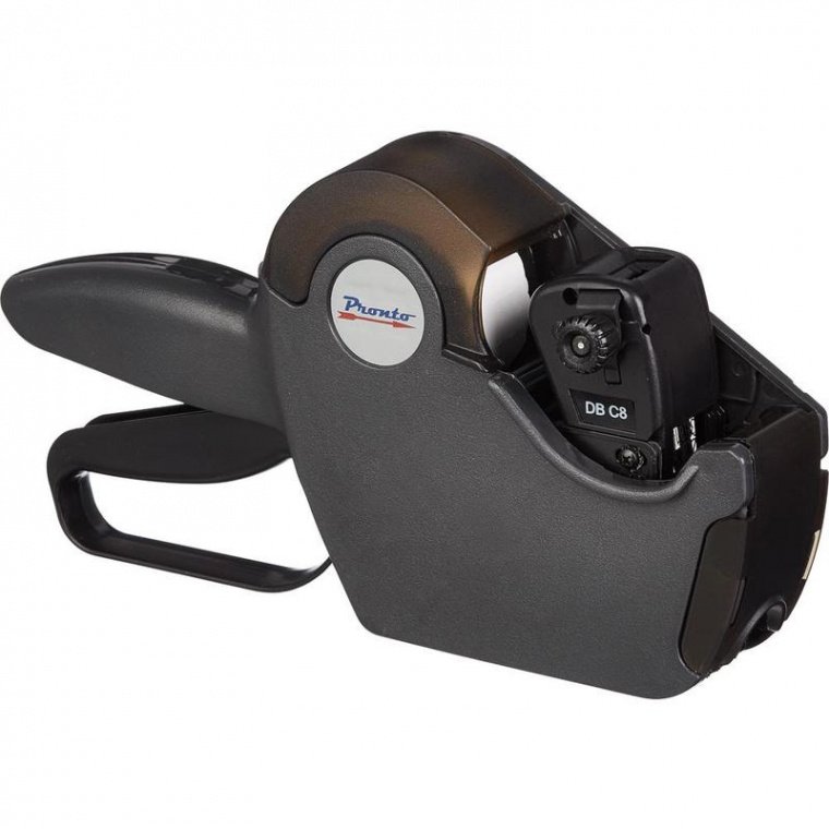 Однострочный этикет-пистолет Pronto C8, 8 символов в строке. Предназначен для проставления на продукцию даты, цены, артикула и прочей цифровой информации. В этикет-пистолете используется лента с этикетками типа 'волна' размером 26×12 мм (поставляется без ленты). В комплекте один чернильный ролик (заряжен в пистолет).