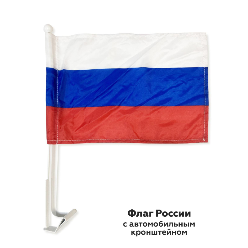 Флаг РФ с автомобильным кронштейном. Флаг - официальный символ Российского государства. Удобный кронштейн позволяет надежно закреплять флаг на автомобильное стекло. Размер: 24x36 см. Материал: шелк.