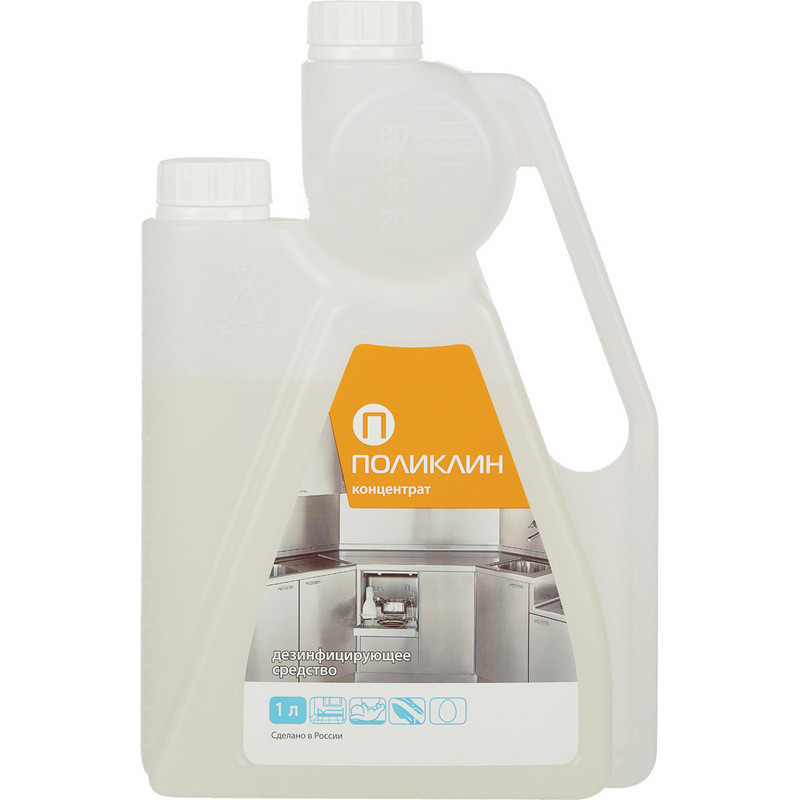 Дезинфицирующее средство 'Поликлин' 1 л (концентрат). Химический состав дезсредства: ЧАС, гуанидин, кислоты, ПАВ. Действующие вещества: алкилдиметилбензиламмоний хлорид (АДБАХ) 12 %, дидецилдиметиламмоний хлорид 0.5 %, молочная кислота 1.5 %, полигексаметиленгуанидин гидрохлорид (ПГМГ) 0.5 %, ПАВы. Сфера применения: акушерские стационары, ЛПУ, клинические лаборатории, станции переливания крови, бактериологические лаборатории, детские учреждения (детсады, школы и т.п.), пенитенциарные учреждения, инфекционные очаги, предприятия общественного питания, предприятия продовольственной торговли, потребительские рынки, коммунальные объекты (бани, бассейны, гостиницы, общественные туалеты и т.п.), учреждения соцобеспечения, парикмахерские, Косметические и (или) массажные салоны, санитарный транспорт, отделения неонатологии, предприятия фармацевтической промышленности, аптеки, отделения физиотерапевтического профиля, учреждения культуры, отдыха (кинотеатры, музеи, театры), спортивные и культурно-оздоровительные комплексы, объекты курортологии, диагностические лаборатории, вирусологические лаборатории, морги и ритуальные учреждения. Объекты обработки: анестезиологическое оборудование, аптечная посуда, баки накопительные автономных туалетов, белье нательное, белье постельное, бытовые кондиционеры, вентиляционные фильтры, воздух в помещениях, воздуховоды, вращающиеся стоматологические инструменты, выделения больного (моча, фекалии, мокрота), гибкие эндоскопы, датчики диагностического оборудования (УЗИ и т.д.), донорская кровь и препараты крови с истекшим сроком годности, жесткая мебель, жесткие эндоскопы, жидкость после ополаскивания зева, заполнение дезбарьеров, дезматов, дезковриков, зеркала с амальгамой, игрушки, ИМН из металлов, резин на основе натурального и силиконового каучука, стекла, пластмасс, ИМН обычные, ИМН одноразовые перед утилизацией, Инструменты к эндоскопам, Инструменты парикмахерских, массажных, косметических салонов, инструменты стоматологические, инструменты хирургические, кровь, крышные кондиционеры, кувезы, лабораторная посуда, медицинские отходы из текстильных материалов (ватные и марлевые тампоны, марля, бинты), мокрота, моча, мусороуборочное оборудование, мусоропроводы, мягкая мебель, напольные покрытия, наркозно-дыхательная аппаратура, ножи, разделочные доски, разделочные столы, тара, обивочные ткани, обувь из кожи, тканей, кожезаменителей, одноразовая посуда, пищевые отходы, пиявки медицинские, плевательницы, поверхности в помещениях, поверхности приборов и аппаратов, посуда из-под выделений, почва, предметы для мытья посуды, предметы личной гигиены, предметы обстановки, предметы ухода за больными, приспособления к кювезам, рвотные массы, резиновые и полипропиленовые коврики, санитарно-техническое оборудование, санитарный транспорт, системы вентиляции и кондиционирования воздуха, скорлупа пищевых яиц, слюноотсосы, смывные воды, спецодежда, сплит-системы, мультизональные сплит-системы, спортивный инвентарь, столовая посуда, стоматологические материалы (оттиски из альгината, силикона, полиэфирной смолы, зубопротезные заготовки, артикуляторы), стоматологические отсасывающие системы, транспорт для перевозки пищевых продуктов, уборочный инвентарь, фекалии, фекально-мочевая взвесь, эндоскопическ