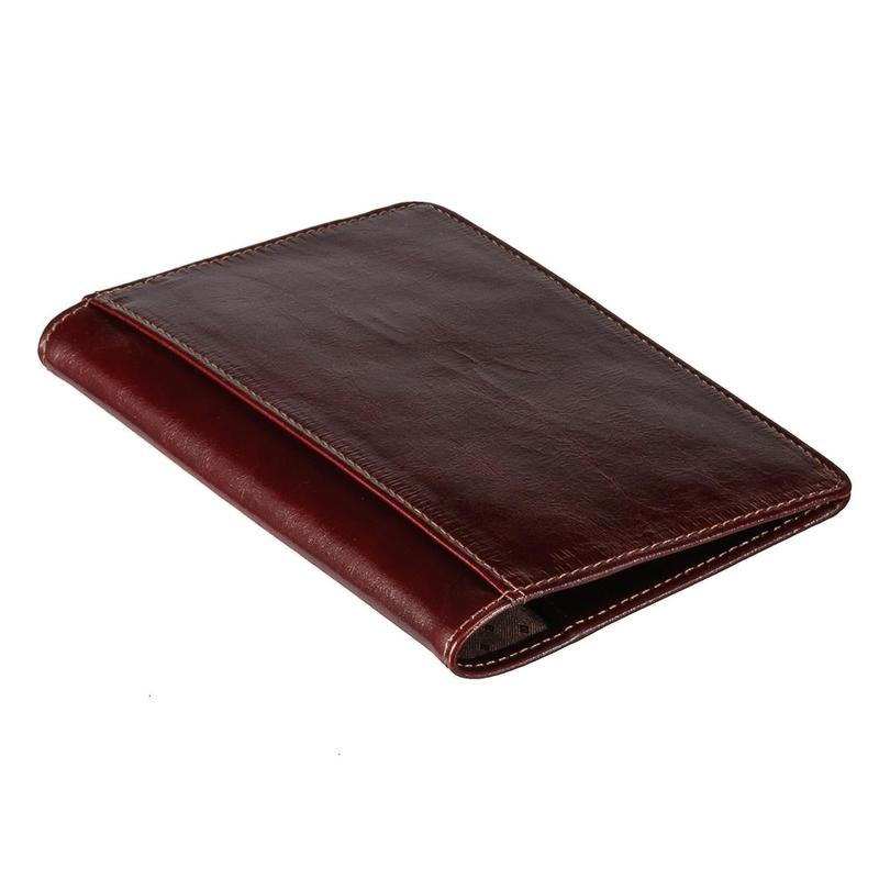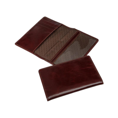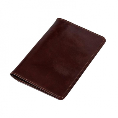 Обложка для паспорта кожаная цвета темный коньяк на подкладке, внутри наборная визитница, два внутренних кармана, карман на задней наружной стенке. Размеры обложки — 95×135 мм.
