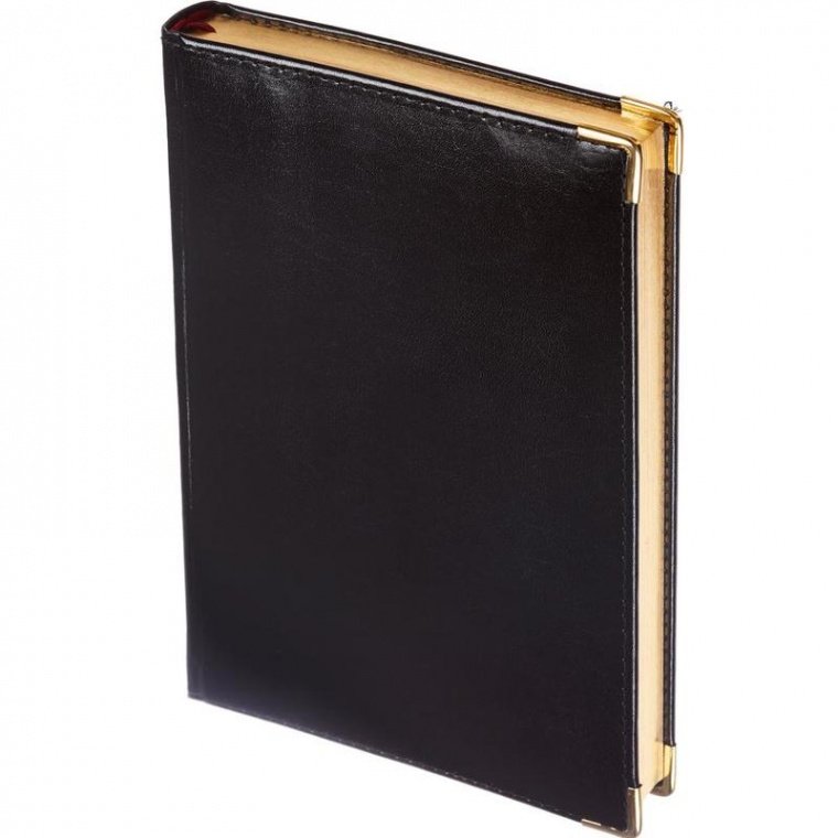 Ежедневник полудатированный Bruno Visconti, цвет черный. Коллекция Imperium. Формата А5 (143×210 мм), размер ежедневника — 145×216 мм. Выполнен в строгом классическом стиле. Обложка из натуральной полуматовой кожи тонкой фактуры. По периметру проходит отделочная строчка. Стильный и респектабельный бизнес — ежедневник — выбор самых взыскательных профессионалов, которые отдают предпочтение элегантной классике. Уголки закругленной формы сделаны из металла. Блок: полудатированный, из бежевой офсетной бумаги высокой плотности, 70 г/кв.м, 208 листов (416 страниц) с золотистым обрезом. Для удобства использования предусмотрено два ляссе. Первые 19 страниц отведены под справочные сведения, в конце на 28 страницах представлена телефонная книга и карта мира на вклейке. Ежедневник дополнен полноцветной вклейкой с географической картой. Две закладки-ляссе бордового цвета помогут быстро ориентироваться в записях. Ежедневник в индивидуальной упаковке.