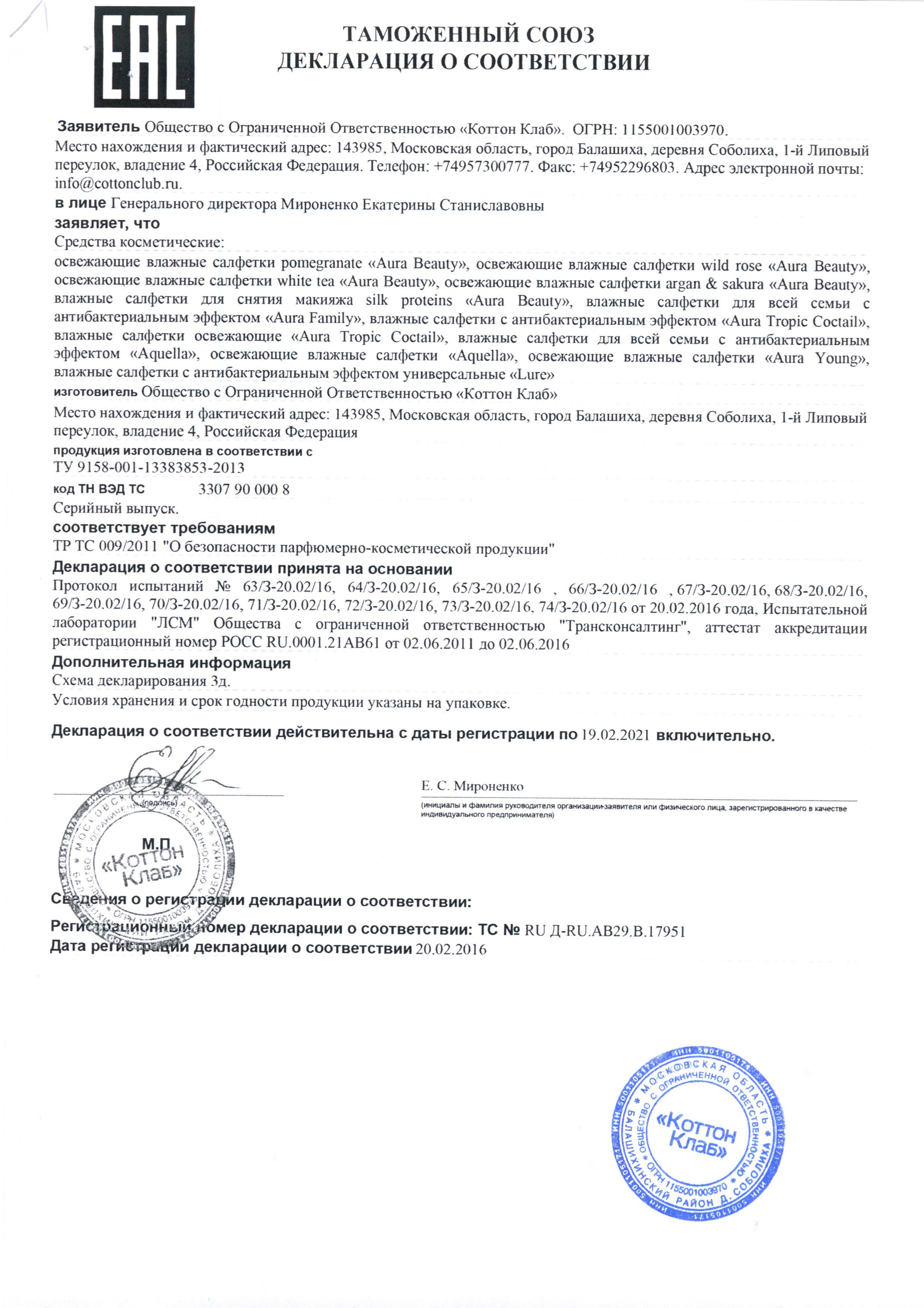 Сертификат на товар - Влажные салфетки антибактериальные Aura 15 штук в упаковке