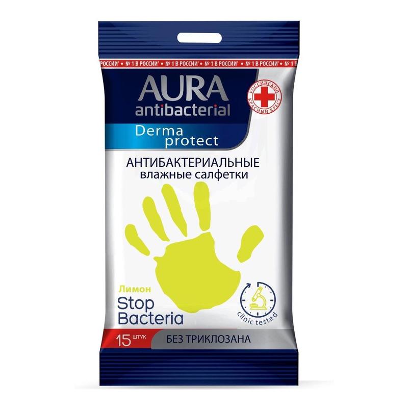 Влажные салфетки антибактериальные Aura 15 штук в упаковке