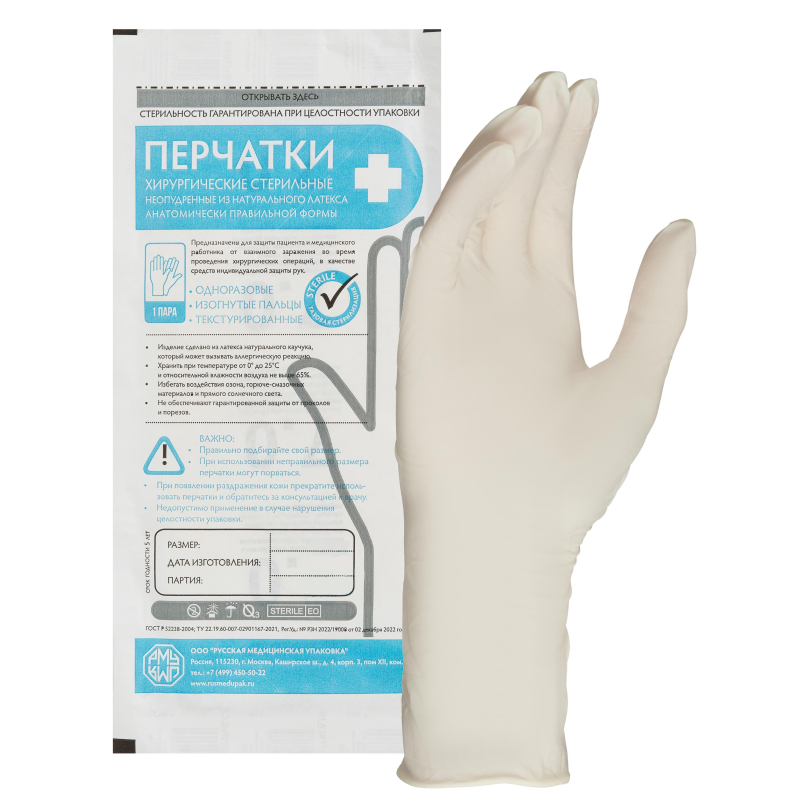 Перчатки стерильные хирургические неопудренные латексные текстурированные полностью анатомической формы. Уровень качества (водный тест) AQL 1,0 Размер: 6 Ширина ладони(+-6мм): 77 Длина: 290 мм (+- 5 мм) Толщина на ладони 0,22 мм Внешний вид: Натурального светлого цвета, с валиком и микротекстурированные Описание: Разработаны с учётом особенностей кистей рук, изогнутые пальцы, микротекстурированная поверхность. Физические свойства: До обработки: Относительное удлинение, не менее 820% Относительное остаточное удлинение, не более 10%. После 4-х кратнойобработки по ГОСТ 3-88: Относительное удлинение, не менее 900% Относительное остаточное удлинение, не более 10% Пудра: - Ускоритель вулканизации: Не более 0,01% Водорастворимый протеин: Не более 80 мг/г Первичный тест на раздражение: Отрицательно Кожная чувствительность: Отрицально, отсутствие аллергенной реакции подтверждено лабораторными тестами Стерилизация: газовая Упаковка: 90 пар в боксе индивидуально упакованных в стерильную упаковку из ламинированной бумаги, 4 бокса в коробке (360 пар). Срок годности 3 годаУсловия хранения 5-35 С, не более 95% влажности, в холодном сухом месте в отсутствии прямых солнечных лучей. Производитель DiaMedical, Малайзия Упаковано и стерилизовано ООО РУСМЕДУПАКИзделие сделано из латекса натурального каучука, который может вызвать аллергическую реакцию.
